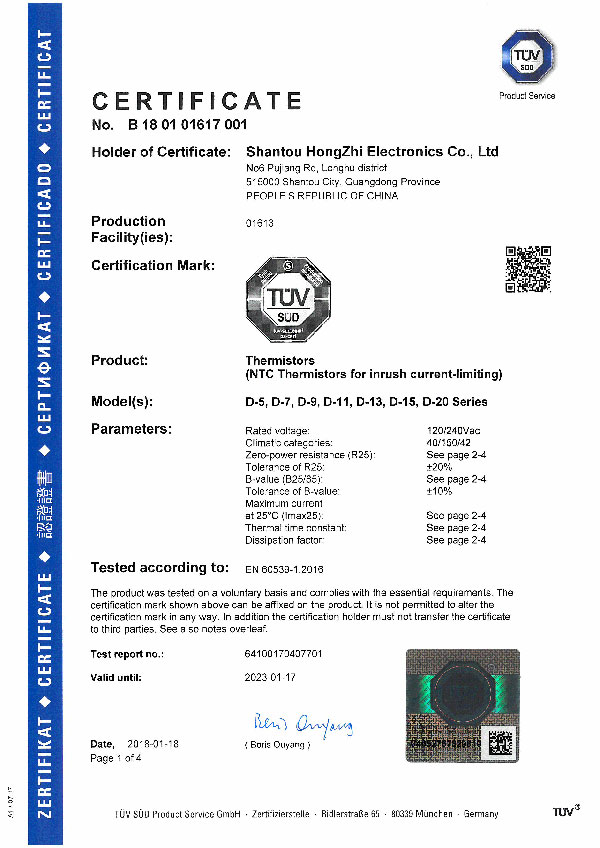 2018年1月,汕頭市鴻志電子有限公司生產(chǎn)的NTC熱敏電阻獲得德國TUV認(rèn)證;至此我司熱敏電阻共有德國TUV.美國UL.中國CQC和美國CUL四個認(rèn)證。
