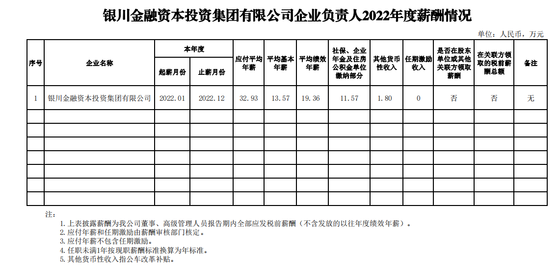 銀川金融資本投資集團國有企業(yè)負責人 2022 年度薪酬情況